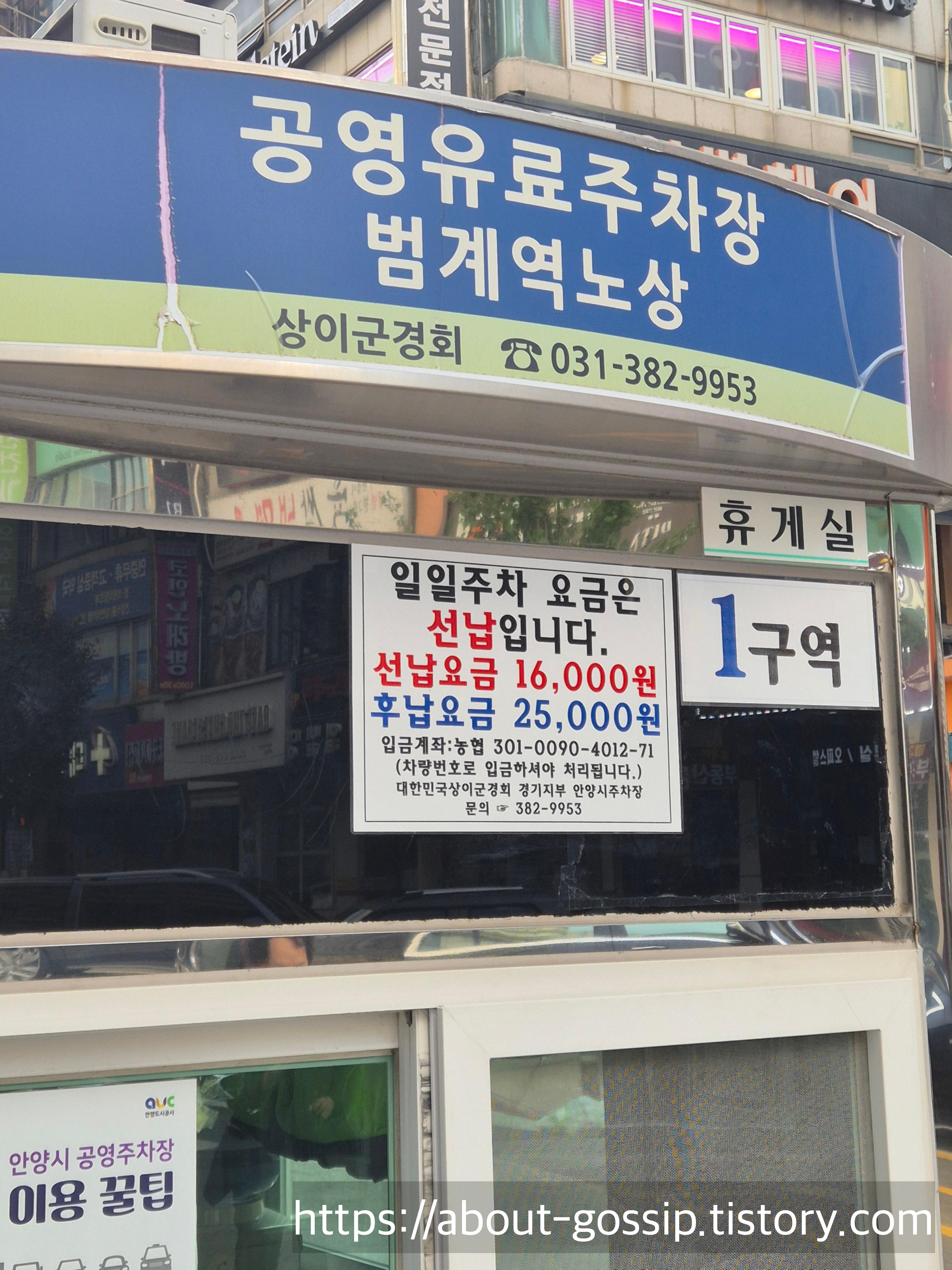 범계역 노상 공영주차장은 독특하게 계좌이체를 통해 요금을 정산합니다. 주차 관리 부스에서 안내하는 계좌로 입금해야 주차 처리가 완료됩니다.