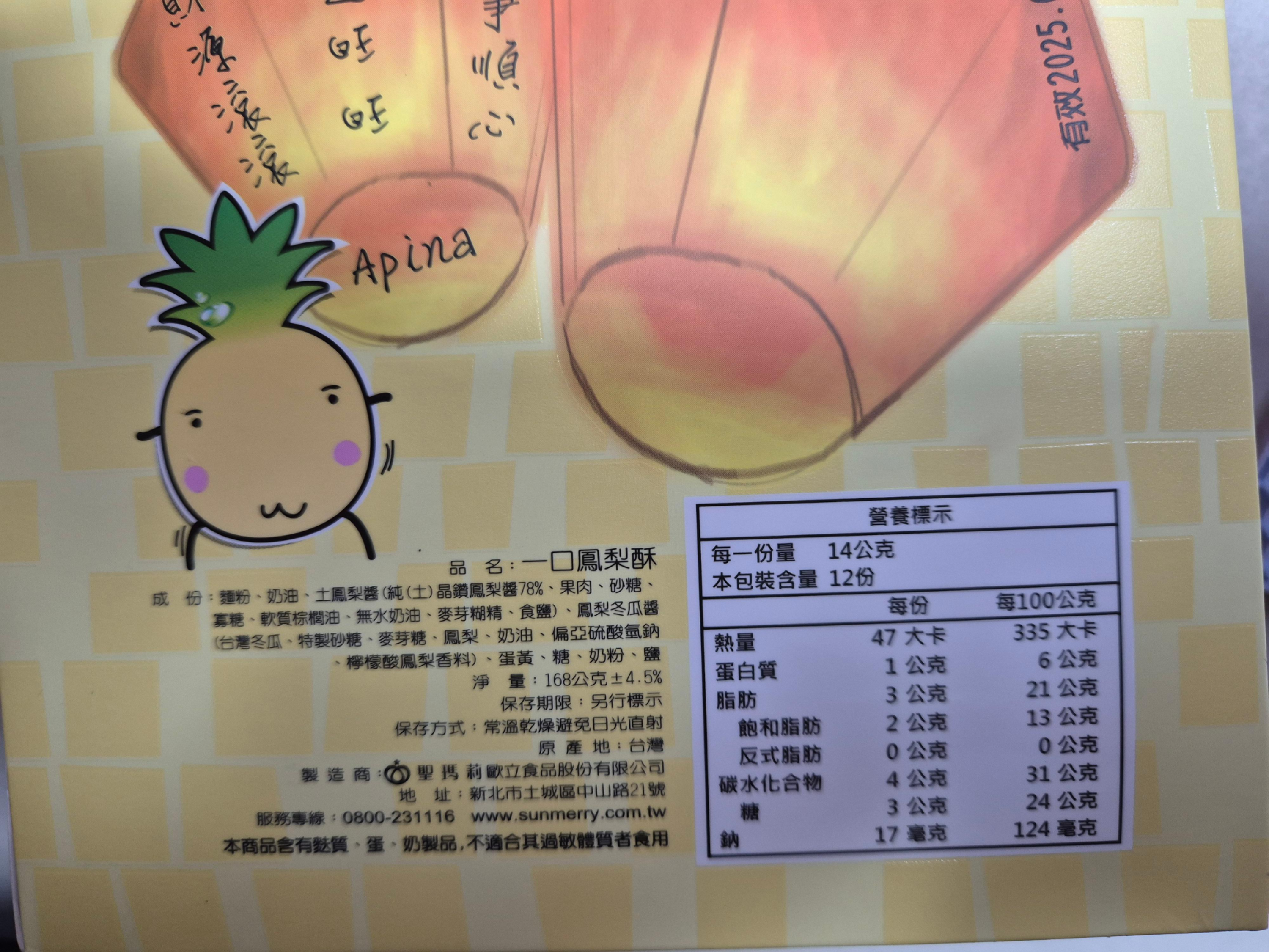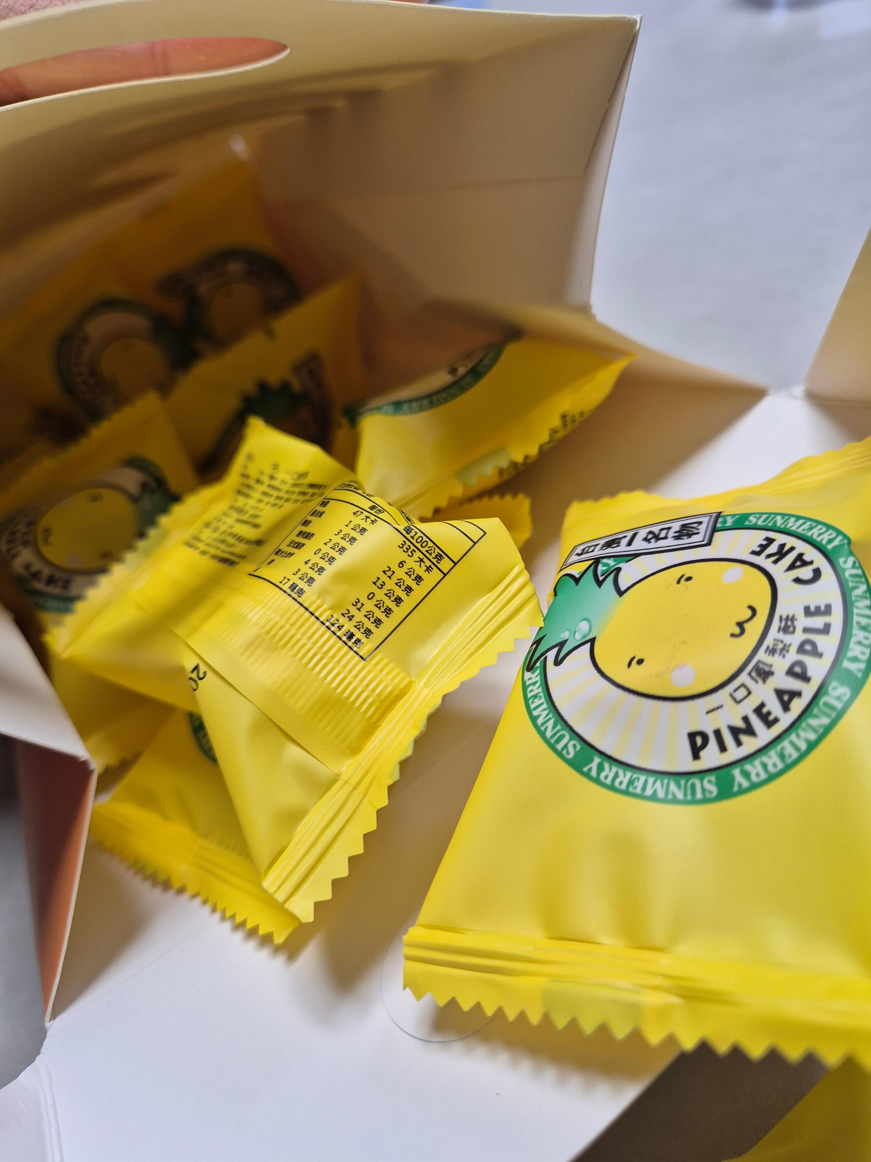 노란색 박스에 귀여운 파인애플 캐릭터('Apina')가 그려져 있어요. 'SUNMERRY(썬메리)'는 대만 여행 가면 꼭 사와야 하는 3대 펑리수 맛집 중 하나로 유명한 곳이에요. 동료분이 센스 있게 유명한 걸로 사오셨네요! 👍