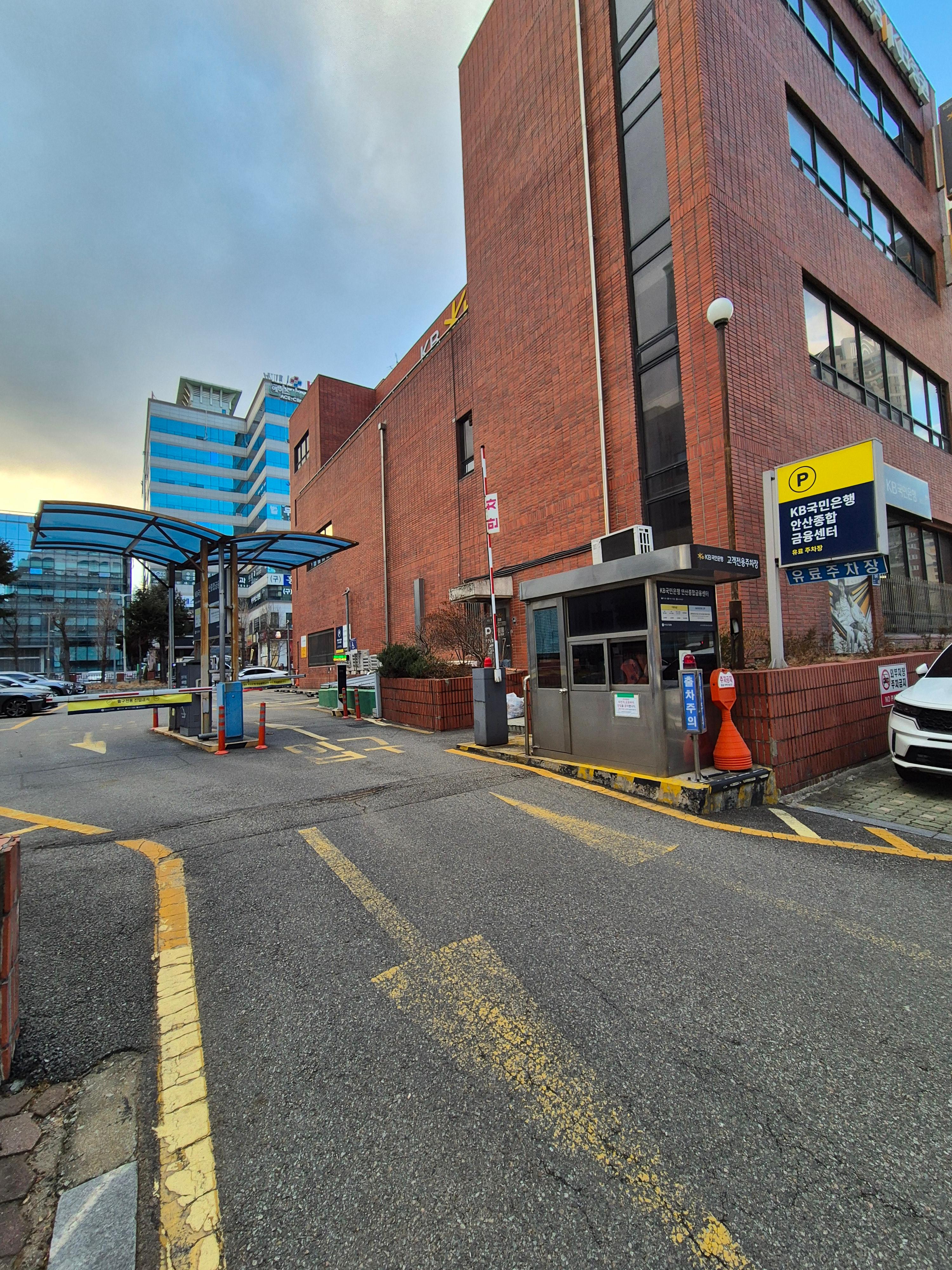 이곳은 KB국민은행 건물 바로 옆에 마련된 지상 주차장입니다. 입구와 출구가 명확히 구분되어 있고, 무인 시스템이라 편리하게 이용 가능해요.